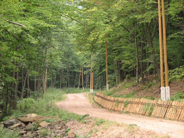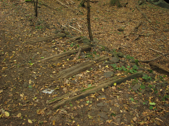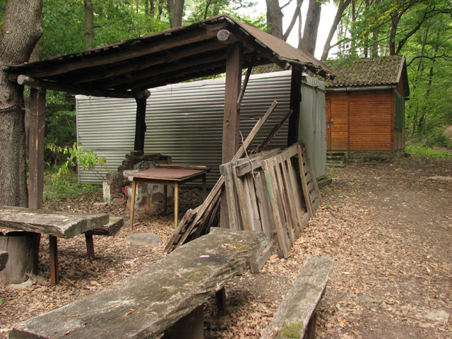 Az előbbi kép bal oldalán elhaladva találjuk meg az egykori ifjúsági tábort. Itt még én is nyaraltam sátorban. Mára ennyi maradt, ahol nagyon nomád viszonyok között még ugyan lehet táborozni, de már nem az, ami volt. A faház mögött volt egy kis ligetes rész, ahova felverhettük a sátrakat. Most egy irtás tátong. A jobb sarokban viszont még észrevehető az egykori keleti kiágazás nyomvonala.