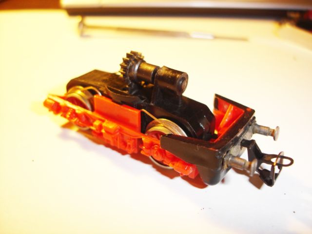Íme, így néz ki az összeállított hajtás. Már bent van a főkeretben és elviekben működőképes. Sajnos ebben a stádiumban még nem önjáró a mozdony, ugyanis a motor két kapcsa a tető alatt elhelyezett elektronikus panelen keresztül kapja a tápfeszültséget, ezért most azt az alkatrészt kell használható állapotba hoznom.