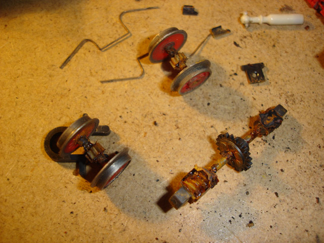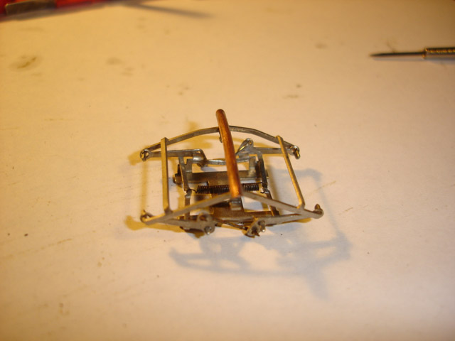 Az első próbakör nagyon keservesre sikeredett. Úgy viselkedett a mozdony, mintha nem kapna stabil tápfeszültséget. Mi lehetett az ok? Ha kicsit lenyomtam a mozdonyt a sínre, akkor nekiindult. Újból szétkaptam és rájöttem, hogy a képen látható áramszedő drótok nem feszültek eléggé a főkereten végigfutó rézlap alsó füleihez. Ez a rézlap szedi fel a kerekekről érkező áramot, majd a kaszniban helyet foglaló panel csatlakozófülei révén továbbítják a motorhoz. Egy apró hajlítás után máris tökéletes lett a kontaktus. Az egy kör szikrázó nyomai azonnal láthatók a frissen tisztított rézlapon.