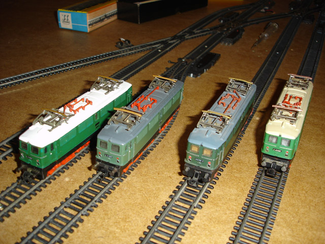 Az összehasonlító tesztkörök mezőnye. Balról jobbra: Zeuke E11, a most javított E42-es fűzöldjéhez hasonló kasznival, de házilag utánfestett tetővel. Majd egy eredeti állapotú, ugyancsak Zeuke E11, de a megszokott DR/DB zölddel és szürke tetővel. Majd egy Bttb-s BR242, a gyártó egyértelműen beazonosítható jegyeivel és felszereltségével, valamint a felújított E42. A vörös/fehércsík festésű Br211-es most nem került fel a pályára.
