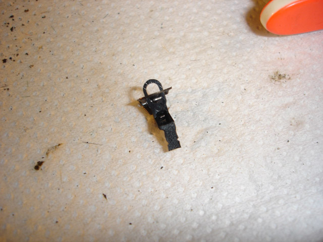 A rövidebb szárú kapcsolónak visszavágtam a rugóval rögzíthető végét és két oldalt egy kicsit bevágtam, hogy a fém befogóba biztosan beszoruljon. Miután bekerült a helyére, a túllógó szárcsonkot forrasztópákával visszaolvasztottam, hogy ne lehessen kihúzni. Eredetileg fém kapcsoló volt bent és annak a szára mintegy 1,5 mm-nyit vissza volt hajtva. Itt az olvasztás pótolta mindezt.