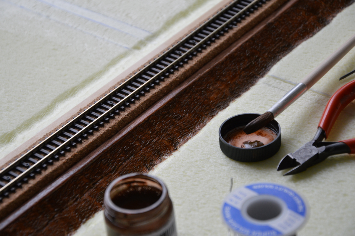 A sínvég darabot kis ecsettel fessük le barnára, hogy
