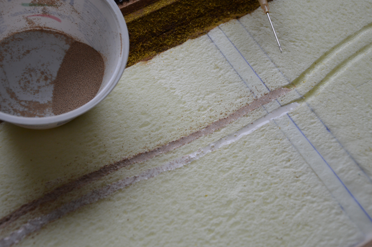 Ezután megszóróm kőporral és kitöltöm ragasztóval. Ebben az
