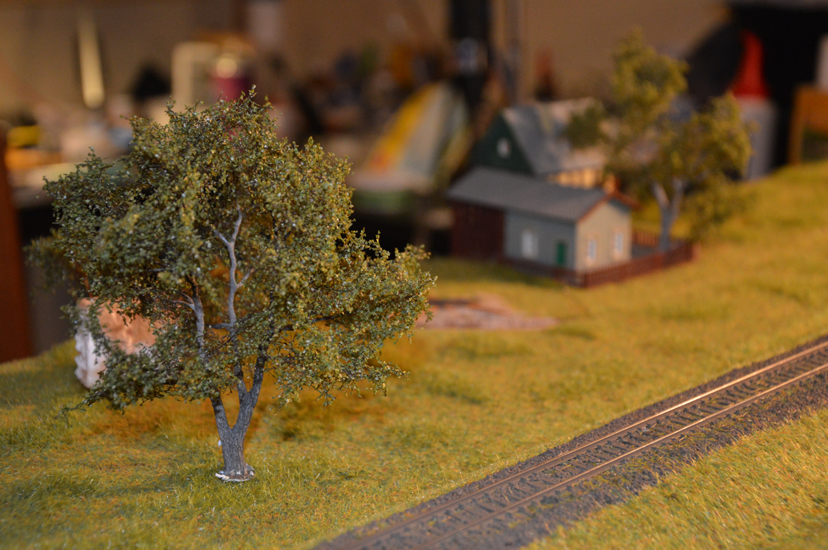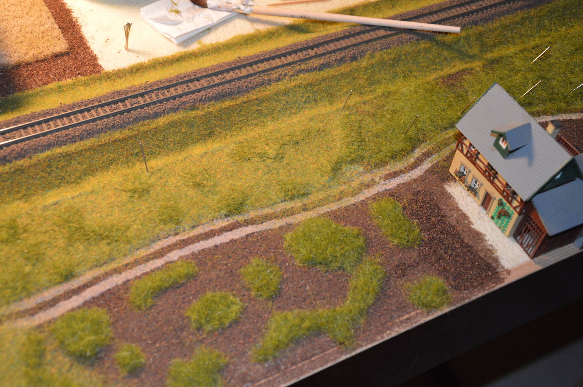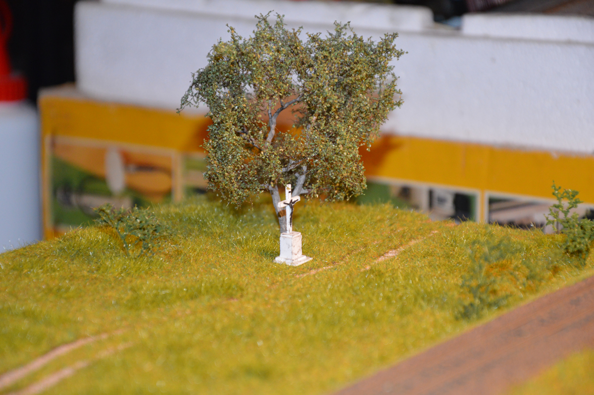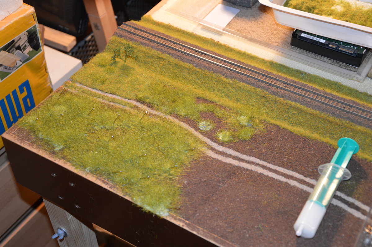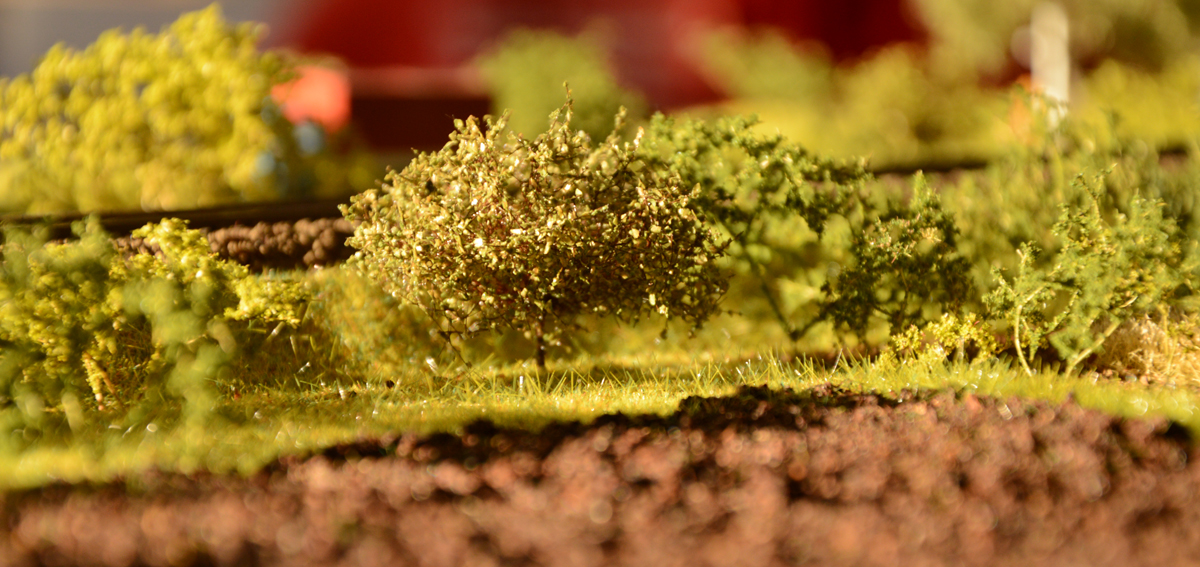 realisztikus növényzetet előre fúrt lukakba ragasztom. A kisebb cserjéket a