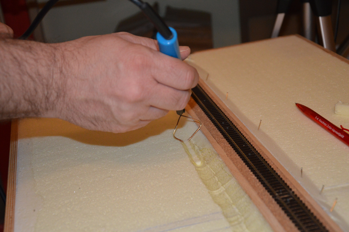 forrasszunk úgy, hogy a sínszálakat ne nyomjuk a rögzítő elemre, hanem