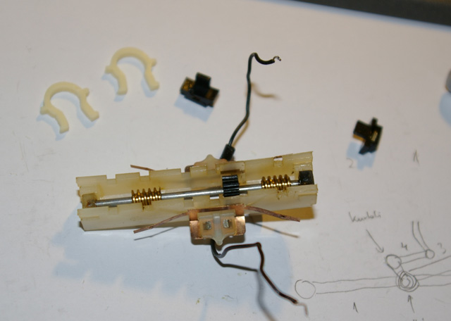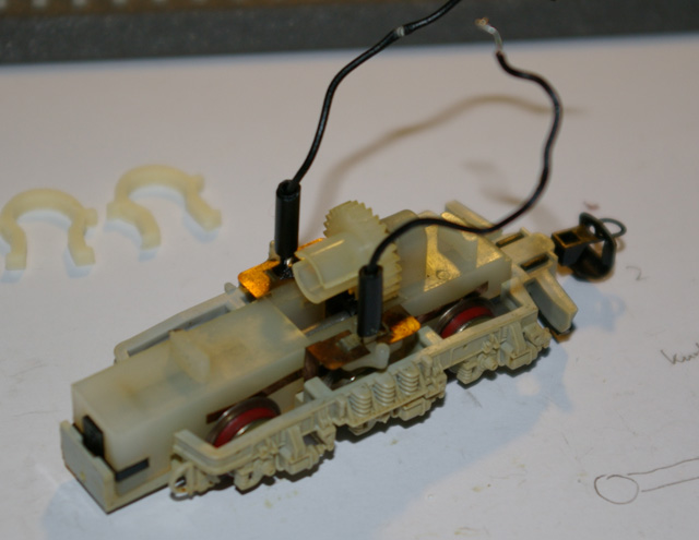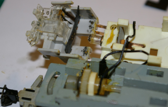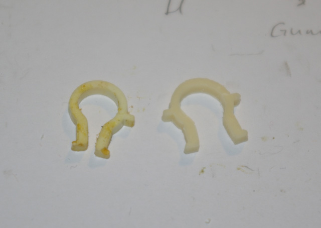 Az egész szennyeződéses történetet még az alapvető konstrukciós probléma is tetézte: a forgóvázat rögzítő ómega bizony a szivaccsal együtt öregedett, így ez az alkatrész is elkezdett törni, hasadni, amint megmozdítottam. Megoldás: új alkatrész beszerzése. Mivel már nem gyártják, ezért "utángyártott" ómegákat kellett beszereznem, amiket ügyes kezű modellező mesterek öntöttek műgyantából. Különlegessége, hogy megfeszített állapotban lettek leöntve, így berakáskor valóban nekifeszülnek a forgóvázban kialakított réseknek. Balra a törött, elöregedett ómega, jobbra az új.