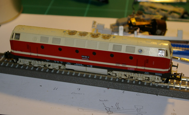 A kész, kitisztított mozdony. A próbák során szépen indult, bár kicsit érződik rajta, hogy csak két tengely hajtja összesen. A szervizelést mindenképp segítette, hogy ebből a modellből összesen három van készleten, így van mód minden alkatrészből a legszebbet felhasználni. Egyedül a korábban említett ómega a fogyóeszköz, de ez könnyen beszerezhető. Az utolsó simítások során a négy tetőszellőző került a helyére, hisz ezek egyike alatt van a kasztnit rögzítő csavar. Sajnos ez könnyen lejár, ezért ide is egy újat kellett bepattintanom.