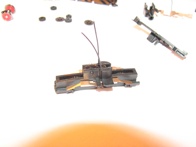 Következő lépés a két vázfél összepattintása. Ragasztani nem kell és tilos! Elég egy rosszul irányzott csepp és vége a hajtásnak. Az áramszedő lemezek gyárilag egybe vannak forrasztva a kivezető dróttal. A lemez középső kiszélesítése nagyobb, mint a két szélső, mert a középső kerék az ívek miatt oldalra is többet mozdul. Ha ezzel kész vagyunk, akkor tegyük félre és jöhet a másik forgóváz.