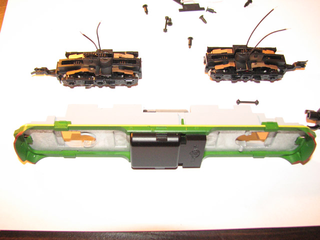 A mellékelt, meglehetősen igénytelen kartondobozban pedig ott volt az összes apróság: a két forgóváz-fél, a palástjuk darabokban, az összes fogaskerék, kardánok, áttételházak, áramszedőlemezek, kerekek, gumigyűrűk külön. A motor a rászerelt két lendítősúllyal, valamint a vezérállást imitáló, fekete kupak. Összerakási leírás nincs a dobozban, pedig a megszokott modellkísérő, ismertető mellett elférne.